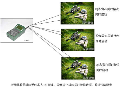 基于以上原理,铭恒无线真人CS装备在背心和激光发射器里安装了相同的无线数传模块,大遥发出战斗开始和战斗结束命令时,各背心和各激光发射器同时收到自行启动。没有多个模块同时发数数据的情况就没有干扰、设备稳定。