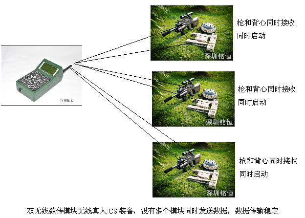 铭恒科技的无线装备,枪和背心能同时接收,以这个为基础,铭恒科技通过它实现了比对和纠错,有两条链路在接收,只要其中一条链路能有效收到就行了,相当于两条链路并行接收对吧,接收链路的粗壮性又增加了一倍对吧。
